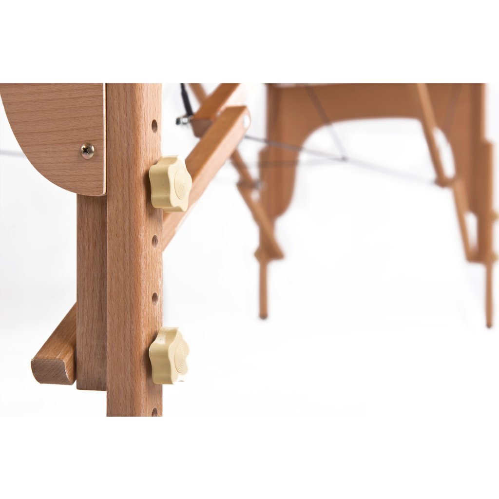 Bukové nohy nášho masážneho stola sú vybavené protišmykovými koncovkami, ktoré nielen zabezpečujú stabilitu, ale aj bezpečnosť počas používania. Navyše, nohy majú vyfrézovanú drážku, ktorá poskytuje ešte väčšiu istotu stability. Výška masážneho lehátka je ľahko nastaviteľná pomocou dvoch hviezdicových matíc, ktoré umožňujú nastavenie výšky stola v rozmedzí od 61 do 86 cm, čo zaručuje optimálne pracovné podmienky pre akéhokoľvek maséra či terapeuta. Vďaka pevnej konštrukcii a starostlivému spracovaniu materiálov náš stôl zabezpečuje nielen pohodlie, ale aj maximálnu bezpečnosť počas ošetrenia, čím zaručuje spokojnosť ako maséra, tak aj klienta.