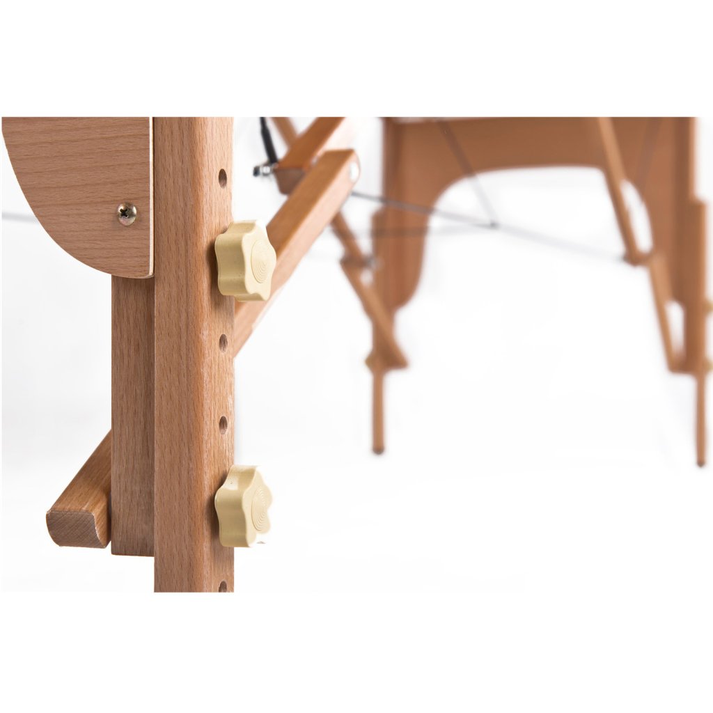 Masážne stoly Medimas vynikajú vysokou stabilitou a eleganciou, ktoré sú výsledkom použitých kvalitných materiálov a precízneho spracovania. Ich frézované nohy z pevného bukového dreva s protišmykovými koncovkami zabezpečujú vysokú stabilitu a bránia posúvaniu počas procedúry. Výška masážneho stola je ľahko regulovateľná v rozmedzí od 61 do 86 cm pomocou dvoch hviezdicových matíc, ktoré vám zabezpečia optimálne pracovné podmienky.